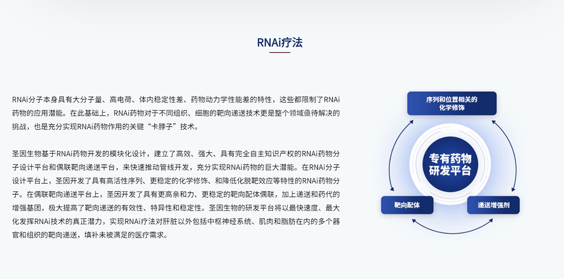 圣因生物成立于2021年初,是一家致力于开发基于RNA干扰(RNAi)技术的新型小核酸药物的生物制药公司,在中国、美国均拥有研发中心。
